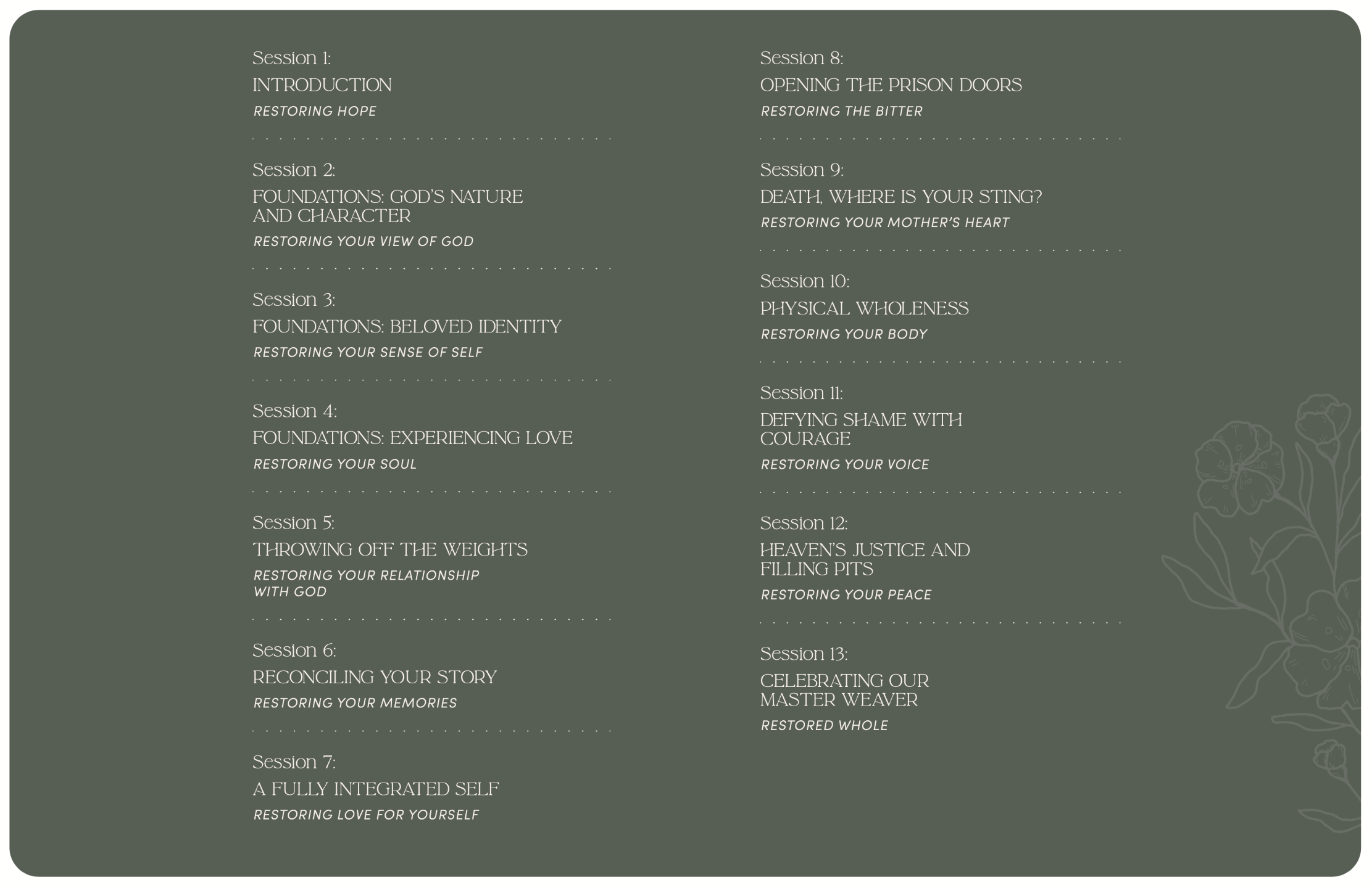 Each of our 13 sessions were crafted to create moments of learning and windows of opportunity with the goal of integration in mind, so the transformational power of God’s love can restore every part of you, spirit, soul, and body, whole.
